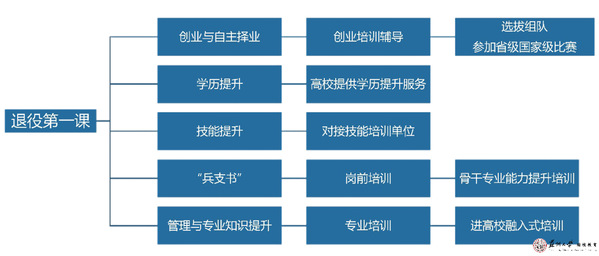 苏州大学退役军人教育培训学院积极对接省市退役军人事务局,以“为退役军人,坚决当好退役军人中转站”为服务宗旨,提供相应的培训。按照“整合资源、提高效率、规范管理、注重质量”的原则,依托江苏省军转干部进高校专项培训基地提出新构想,建设军转干部教育、退役军人事务系统教育、退役士兵(士官)教育三大中心,分为“两个阶段、五大模块、八种形式”:在成长阶段上,分安置前和安置后两个阶段。其中安置前培训以“聚焦政策解读、强化适应能力、理性选岗择岗”为主,安置后培训以“突出个性需求、促进人岗相适、加快转型发展”为主。打造“退役第一课”“学历教育+职业教育”“技能培训+定向培训”“能力素质提升+就业创业帮扶”相互融会贯通的学习体系,完善线上平台服务,以现场教学为载体,建立“线上+线下”相结合的培训体系,实现“理论+实践”相结合。