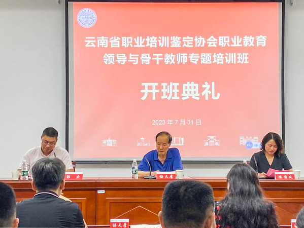 杨天厚作开班动员讲话。他首先对我校为此次培训的精心组织和安排表示感谢,并阐述了本次培训的举办背景和举办意义。他希望通过此次培训,加强职教师资队伍建设,提高云南省职业培训评价认定系统领导干部、管理干部、骨干教师的思想政治素质、理论素养、实际业务水平及工作能力,以适应新形势、新任务要求;希望学员们做到学用相长、融会贯通,把所学到的知识经验运用到实际工作中去,更好地服务和保障职业培训鉴定事业的高质量发展。最后,他预祝学员们在培训期间学习生活愉快。