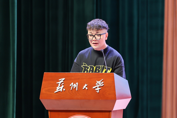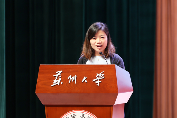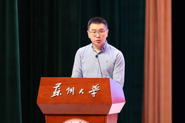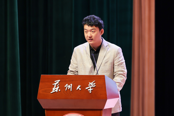 教师代表陆游老师以师长的身份为同学们分享了开启苏大学习之旅的几点感想。他勉励大家珍惜大学时光,与老师们一起,为自己的未来,为苏州的未来,为国家的未来努力前行,成为既具备全局视野,又精通微观技能的卓越人才。