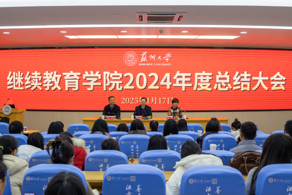 2025年1月17日,苏州大学继续教育学院2024年度总结大会在天赐庄校区(北区)工科楼一楼报告厅召开,总结年度工作,部署下一年度工作。会议由继续教育学院院长缪世林主持,全体教职工参会。
