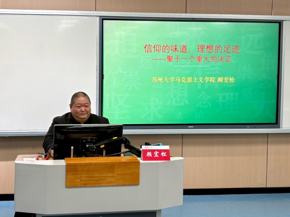苏州大学马克思主义学院思想道德与法治教研室主任顾宏松在“信仰的味道,理想的足迹——聚于一个重大的决定”专题讲座中,围绕新时代的历史性变革,系统阐释了国家在经济建设、科技创新、文化发展等多个方面实现的跨越式进步。他强调,中国式现代化不仅体现在物质层面的飞速发展,更彰显了中国特色社会主义道路的独特优势与精神内涵。顾宏松通过分享众多科学家和先进模范的感人事迹,弘扬了以爱国主义为核心的民族精神和以创新奉献为特征的科学家精神,有效激发了学生的使命感和责任感,引导大家在新时代征程中找准人生方向,勇担时代重任,以实际行动书写无愧于时代的青春篇章。