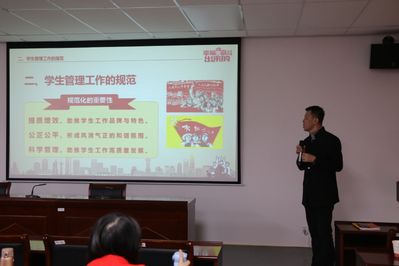 苏州大学学生工作(部)副部长段永锋作《加强管理规范化,夯实学生管理基础》的讲座,段部长从学生管理的工作目标,学生管理工作的规范,学生管理的重点内容、重要节点、重点人群,结合生动的案例四个方面阐述。对于学生管理工作提出了很多有效的建议。