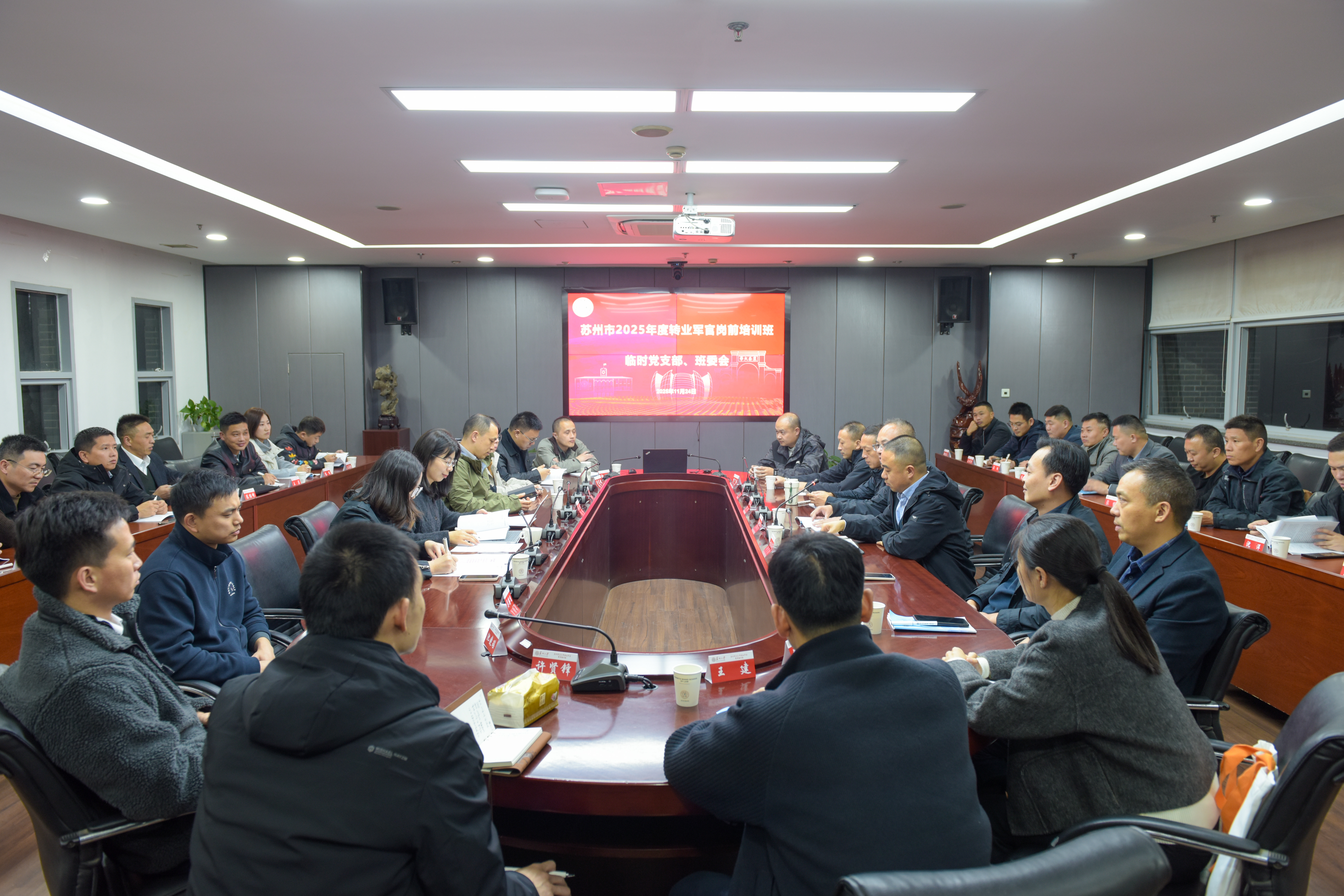 2025年11月24日,苏州市2025年度转业军官岗前培训班在我校顺利开班,来自苏州市各地的116名转业军官参加了此次培训。苏州市退役军人事务局副局长刘伟,中共苏州市委组织部干部一处处长邹国祥,苏州市退役军人事务局移交安置处处长刘国齐,苏州大学校党委常委、副校长姚建林,退役军人事务培训学院院长缪世林出席开班仪式。
