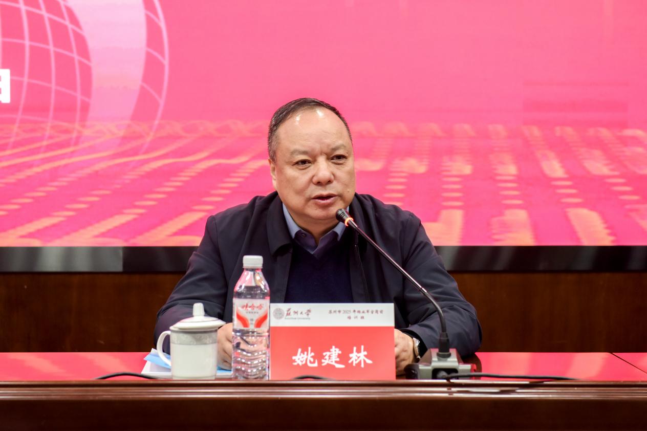 姚建林致欢迎辞。他首先对前来参训的学员表示欢迎,并介绍了苏州大学的办学历史和取得成效。他表示,学校将整合优质教学资源,全力保障转业军官学员实现从“军旅英才”到“地方栋梁”的转型,助力大家在苏州高质量发展中发挥更大作用。