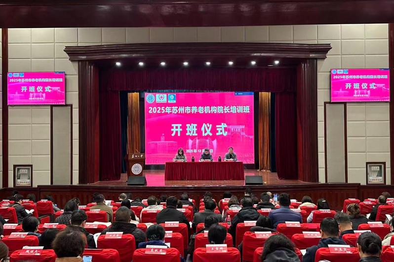 12月18日上午,2025年苏州市养老机构院长培训班开班仪式在苏州大学天赐庄校区敬贤堂举行。来自全市六区四县的203名养老机构院长参加了本次培训。苏州市民政局副局长严强,苏州大学管理培训学院副院长陈耀出席仪式并讲话。开班仪式由苏州大学管理培训学院班主任马婧婧主持。