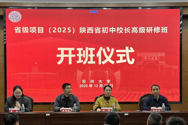 12月23日下午,省级项目(2025)——陕西省初中校长高级研修班开班仪式在苏州大学王健法学院西式模拟法庭举行。来自陕西省各地的80余名初中校长参加了开班仪式。渭南师范学院继续教育学院院长景根杰,苏州大学管理培训学院副院长赵曜,渭南师范学院教授、项目首席专家赵教练出席了仪式。仪式由苏州大学管理培训学院班主任蔡众主持。