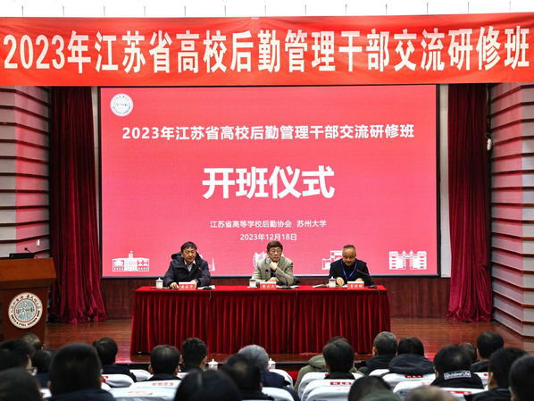 为深入贯彻落实党的二十大精神,积极适应新时代教育发展形势和高校后勤改革发展要求,加快推进江苏高校后勤高质量发展,12月18日至19日,由江苏省高等学校后勤协会主办、苏州大学承办的“2023年江苏省高校后勤管理干部交流研修班”在我校顺利举办。江苏省高校后勤协会会长、东南大学党委常委、副校长黄大卫,江苏省高校后勤协会副会长兼思想文化与人力资源管理专业委员会主任、苏州大学党委常委、副校长查佐明,苏州大学继续教育学院院长缪世林,江苏省高校后勤协会思想文化专业委员会副主任兼秘书长、苏州大学后勤管理处处长仇玉山出席开班仪式,仪式由江苏省高等学校后勤协会副会长兼秘书长黄在宇主持。