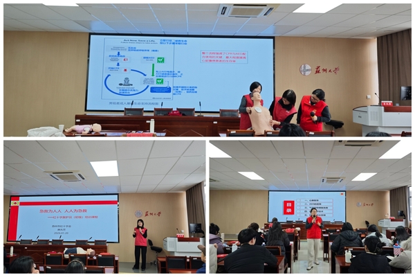 本次培训采取理论讲解与实操演练相结合的方式,包括急救知识讲解、急救技能操练和实践考试演练三个环节。苏州大学附属第一医院护理部主任护师、助教唐兆芳,苏州口腔医院党委书记、副主任护师薛花,苏州大学附属第一医院急诊室护士长、副主任护师董爱华,重点围绕心肺复苏、AED的使用、气道异物梗阻急救、创伤救护技术、伤病员体位管理等相关知识和操作方法进行详细讲解和规范的操作示范。