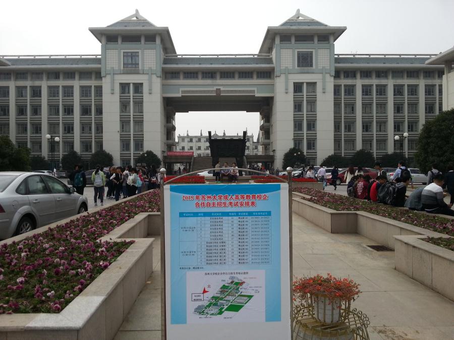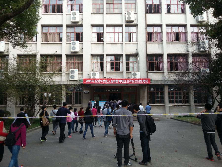 苏州大学2015年成人高等教育校企合作自主招生考试于10月25日在苏大校本部博远楼进行,共计一百八十余人报名参加考试。上午9:00-11:30,是文化综合考试,下午13:00-15:00是职业能力考试。整个考试工作,从命题、试卷的印制保管,到考场安排、考务组织、考试等各个环节,都比照国家考试要求组织进行,共设有7个考场,集中在一个楼面,楼层入口,有保安警械,所有考生均准时凭准考证、身份证入场考试。考试巡视员全程巡视,主考及考务人员全程跟踪服务,监考认真负责,整个考试过程,进展顺利,秩序井然,没有发生违规违纪问题。