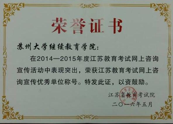 5月9日下午,江苏省教育考试院召开2016年全省教育考试宣传工作会议。我校招生就业处和继续教育处由于在2014-2015年度的江苏省教育考试网上咨询宣传工作中表现突出,被评为优秀单位。全省获得该荣誉称号的普通高校招办共有20家,普通高校继续教育处10家。