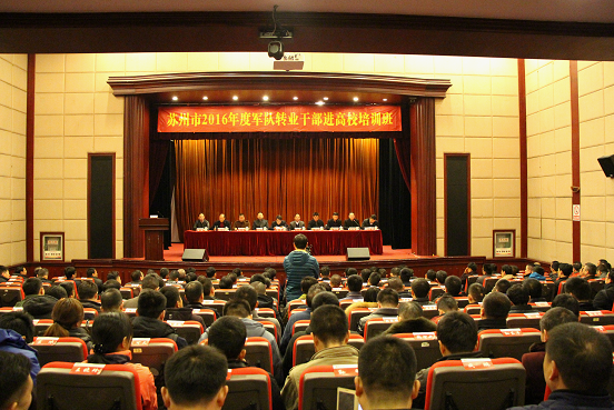 2月20日,苏州市转业军官进高校培训班的241名学员走进我校,开始为期一个月的转业岗位培训。开班典礼在我校敬贤堂举行,苏州市人力资源和社会保障局副局长沈伟、军转处处长薛锋,园林与绿化管理局局长陈大林,民防局局长陈正峰,信访局副局长周加宏,环保局纪检组组长吴洪发,档案局副局长虞爱国,科协副主席顾志华,我校继续教育处处长缪世林、培训科长沈晔等出席了开班典礼,典礼由薛锋主持。