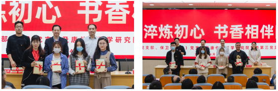 随后,出版社副总编辑袁勇志致辞,苏州大学出版社通过赠书活动为大家提供精神食粮,为校园增添书香,用鼓励多阅读多充电的方式,共同庆祝中国共产党成立100周年。袁勇志、缪世林、周法超、张素萍为师生送上《论中国共产党历史-普及本》《习近平与大学生朋友们》和《改革开放四十年苏州印记》三本书籍,共建支部师生代表上台受赠。