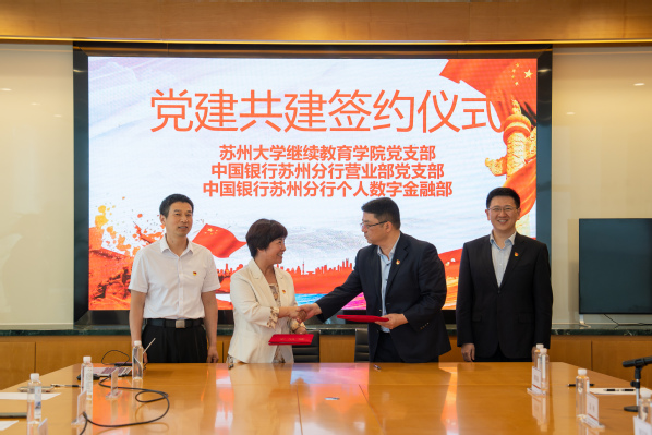 5月20日,苏州大学继续教育学院党支部与中国银行苏州分行营业部党支部共建合作签约仪式在苏州工业园区中银大厦举行。苏州大学继续教育学院副院长董娜、继续教育学院党支部副书记王健,中国银行苏州分行营业部副总经理周富强、中国银行苏州分行个人数字金融部副总经理孔云辉等出席签约仪式。会议由中国银行苏州分行营业部综合管理团队主管高翔主持。