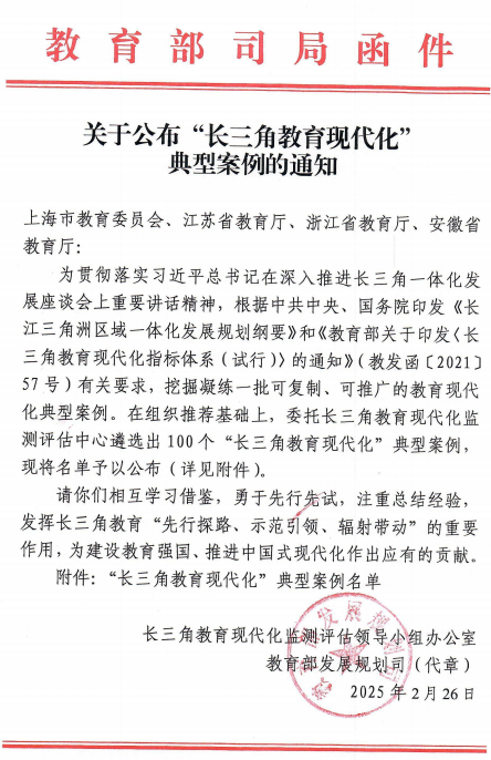 此次案例征集由教育部发展规划司统一部署,共100个案例入选,主要是为了挖掘形成可复制、可推广、可借鉴的长三角教育现代化典型案例,推广先进经验与做法,引导各级各类高校高质量发展。