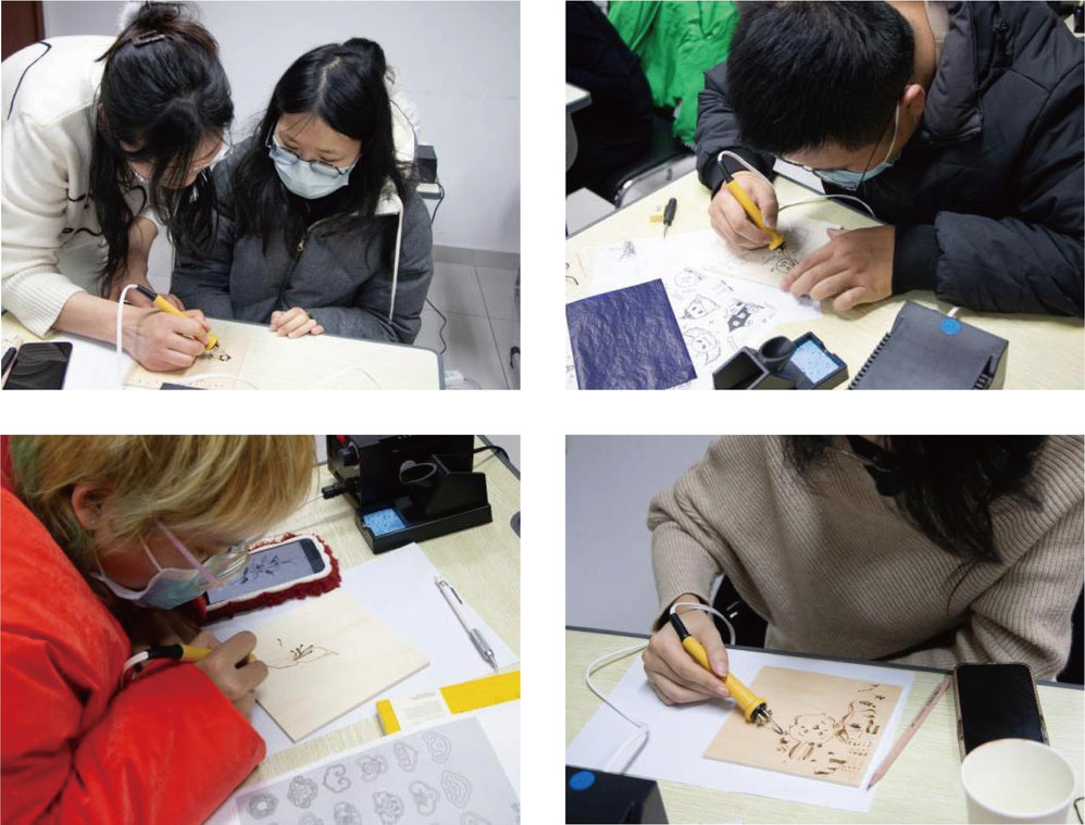 烙画是用温度在三百至八百摄氏度的铁扦代笔,利用碳化原理,在竹木、丝绢、宣纸等材料上作画,巧妙自然地把绘画艺术的各种表现技法与烙画艺术融为一体,形成自己独特的艺术风格。在非遗烙画课上,翟老师为学员带来了烙画的知识科普,随后依次走到学员身边,仔细地辅导大家练习线条的勾画。学员们也十分专注,伴随着空气中淡淡的烧焦味,一幅幅带着温度的图画在学员的笔下显现。